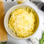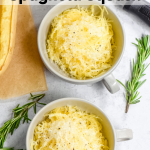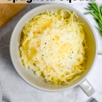 If you want to roast your spaghetti squash in the oven, try this method! Preheat your oven to 425ºF. While the oven is heating, microwave your whole spaghetti squash for 3 minutes. When it’s cool enough to handle, cut in half lengthwise and scoop out the seeds. Microwaving be cutting makes it SOOOOO much easier. Rub the cut side with olive oil and season with salt and pepper. Roast cut side up for 35-40 minutes until tender. Flake noodles with a fork and serve as desired!